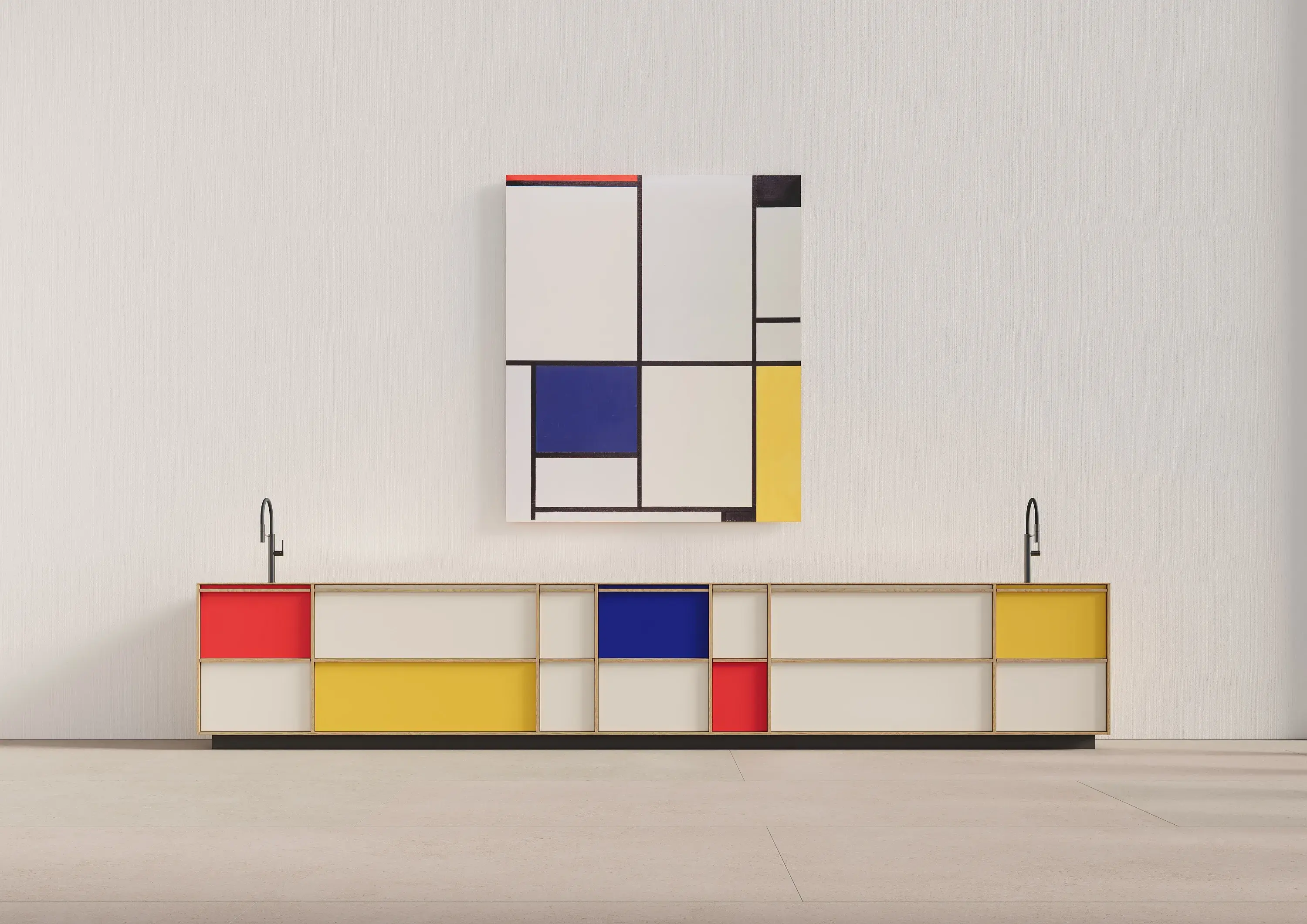 Besonders beeindruckend ist die Komposition in Rot, Blau und Gelb – inspiriert von den klaren Linien und Farben Piet Mondrians. Sie unterstreicht die Möglichkeiten, die sich durch dieses Konzept in der Verbindung von Kunst und Architektur eröffnen.