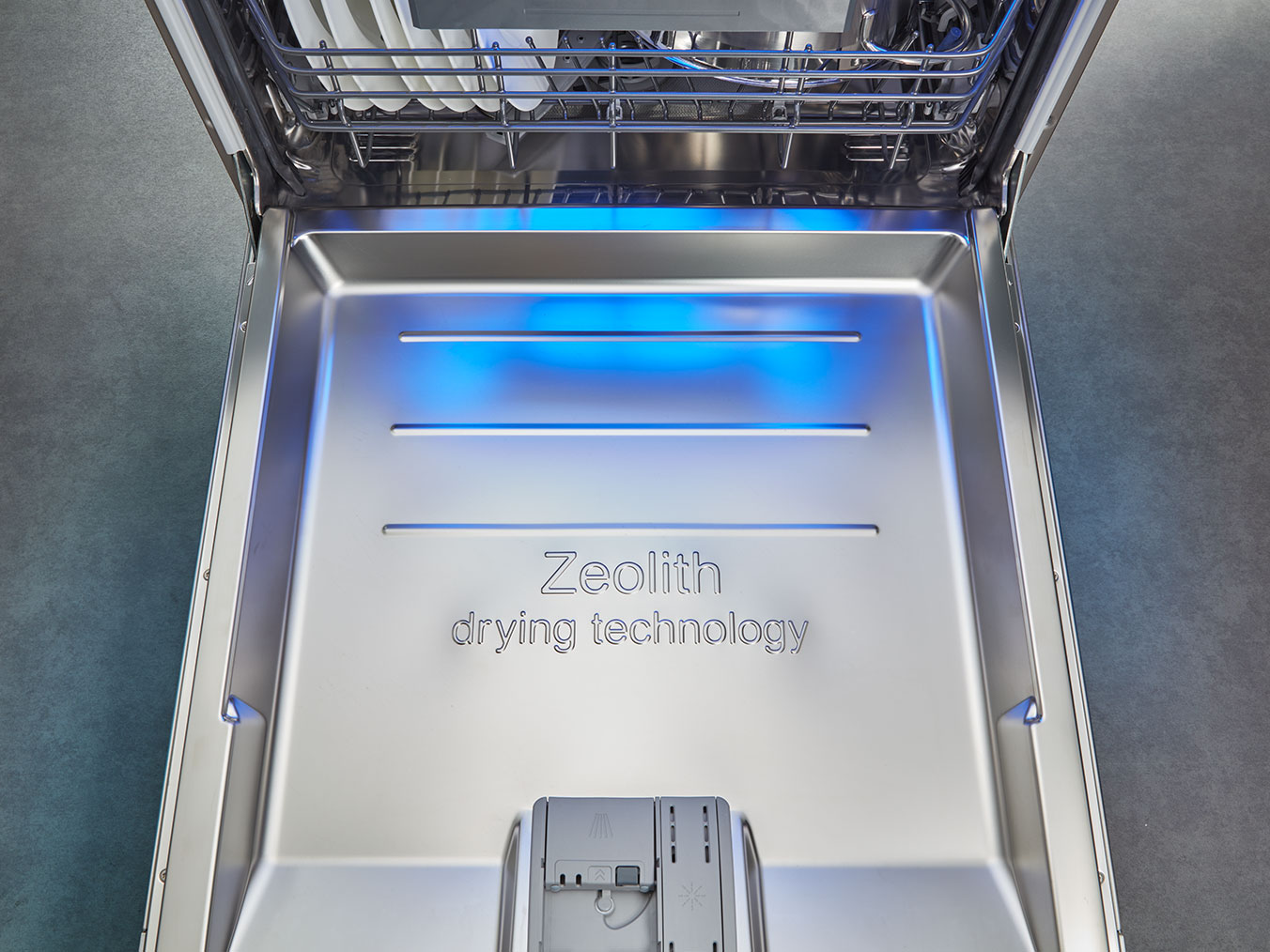 Durch den Einsatz von Zeolith®-Mineralen von Siemens verläuft die Trocknung im Geschirrspüler energieeffizient ab. Damit ist nach Programmende selbst Plastikgeschirr trocken, und man kann sofort alles handwarm entnehmen.