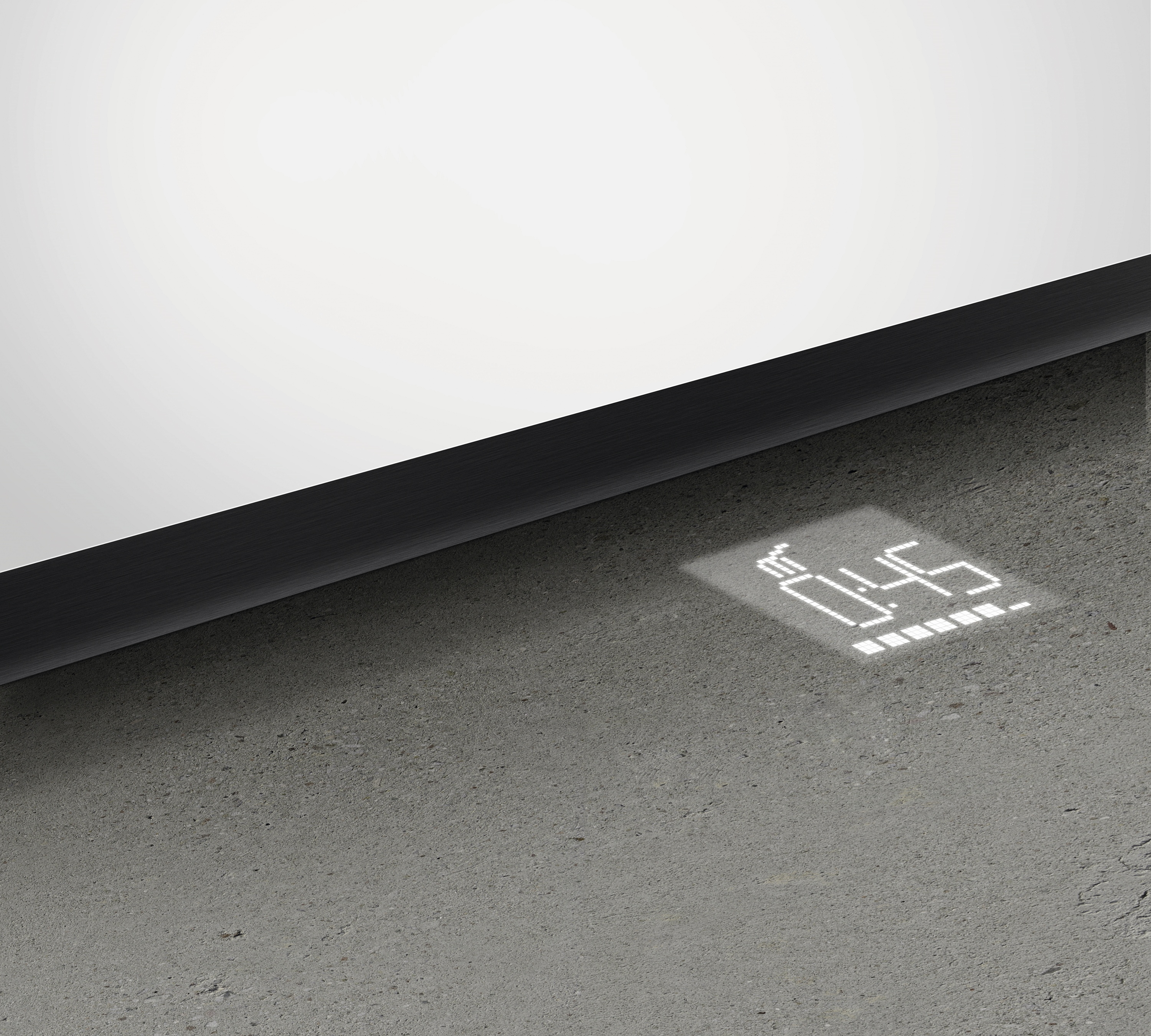 timeLight, infoLight und side­Light zeigen Informationen wie Programmstatus und Restlaufzeit an. Diese Angaben werden entweder auf den Küchenboden projiziert oder leuchten den Möbelspalt neben dem Geschirrspüler aus.